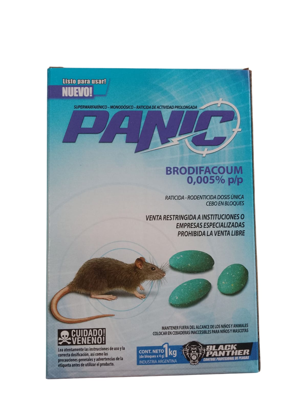 PANIC® es un rodenticida monodosico para el control de Ratas (Rattus rattus y Rattus norvegicus) y ratones (Mus musculus), Akodon spp, Oryzomis spp, etc.